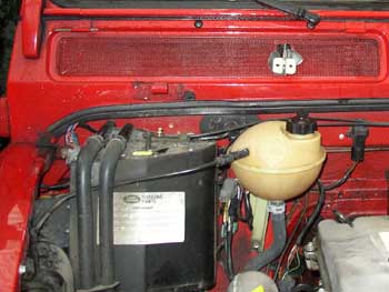 am Armaturenbrett den Heizungshebel auf heiß stellen. Motorhaube öffnen und
