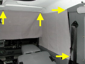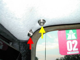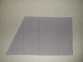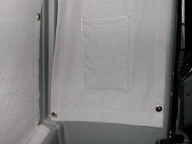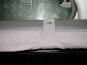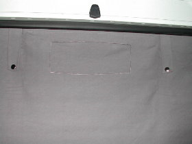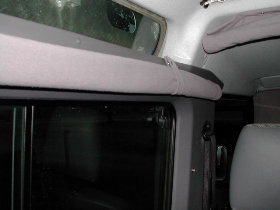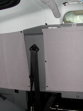 So, jetzt kommen wir zu den hinteren Seitenscheiben: Die Vorhänge wurden so angefertigt, daß man oben und unten eine Holzleiste (5 x 20 mm) einschieben kann. Zur Befestigung wurden die Schrauben durch den Stoff und die Holzleiste direkt in die Innenverkleidung geschraubt. Die untere Holzleiste vereinfacht das Aufrollen. |