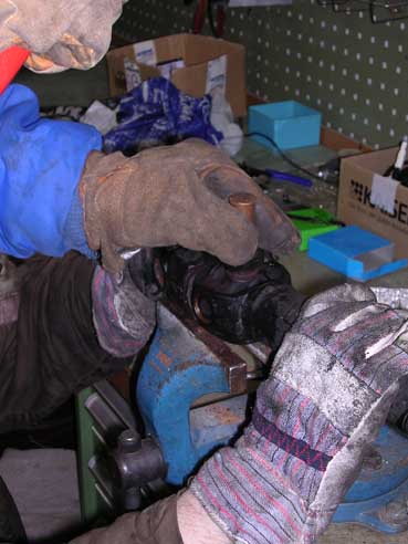 Der nächste Versuch wurde mit einer Schraubzwinge gestartet. Wie man sieht versucht Stephan das Gelenk zu stabilisieren. Letztendlich gelang es uns aber doch mit dem Schraubstock. Natürlich muß, wie bei jedem Gelenk davor wieder die Freigängigkeit mit der Methode Hammer hergestellt werden.