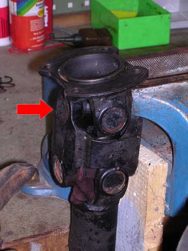 Im nächsten Schritt, setzt man die Kardanwelle seitlich an. Auf dem linken Bild ist mit dem roten Pfeil die herausgetriebene Lagerschale zu erkennen. Wie in beiden Bildern zu erkennen ist, wird auf das Mittelteil des Doppelgelenks geschlagen um die Lagerschalen in die andere Richtung (wie oben) herauszutreiben.