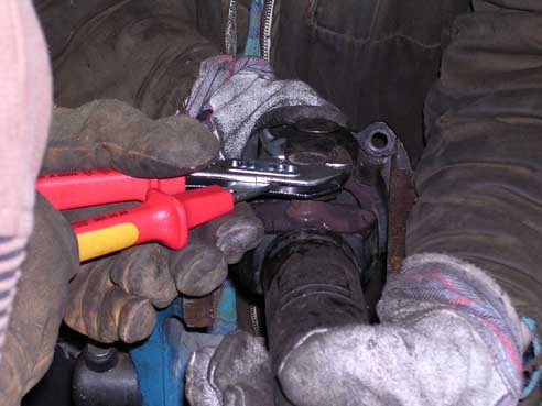 Nach dem Lösen aller Ringe legt man die Welle so auf den Schraubstock, das das Mittelteil des Doppelkardan-Gelenkes plan aufliegt und schlägt mit dem Kupferbolzen die Lager in eine Richtung nach unten.