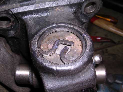 6. Einsetzen des Sicherungsringens. Am einfachsten geht es mit einer Spitzzange und einem Schraubenzieher, mit dem man den Ring in die richtige Lage bugsiert. Danach mit dem Kupferbolzen die gegenüberliegende Lagerschale so weit einschlagen, bis auch hier der Sicherungsring montiert werden kann.