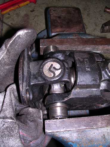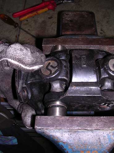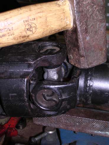 7. Nicht erschrecken! Den Schraubstock soweit öffnen, daß mit den Aluauflagen genügend Spiel ist, damit das Gelenk nicht ansteht. Ein mal auf das Gelenk schlagen und dann um 180 Grad drehen und die Prozedur wiederholen. Der Sinn davon ist, daß das Kreuzgelenk sehr schwergängig ist, weil die Lagerschalen zu viel Druck nach innen ausüben. Mit dieser Aktion werden die Lagerschalen wieder nach außen getrieben und das Lager ist leichtgängig. Wenn es mit dem ersten Schlag nicht funktioniert, die Prozedur wiederholen.