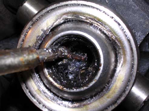 Das hatte ich ganz vergessen, da das einfetten des Nadellagers in der Kugel nichts half - die Nadeln lösten sich - hatten wir diese herausgenommen. Dies sollte man gleich erledigen! Es empfiehlt sich auch, das Lager von dem alten Fett möglichst gut zu reinigen, dann sieht man beim Einsetzen mehr. Hier ist auch sehr schön das vom Werk aus etwas deformierte Lager zu sehen.