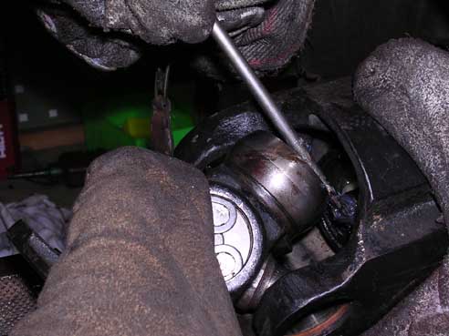 3. Die Lagerschalen (gegenüberliegend gleichzeitig!) vorsichtig mit der Hand einsetzen. 4. Vorsichtig mit dem Hammer die Schalen einschlagen. Später haben wir eine bessere Methode entdeckt! 5. Nun das Kreuzgelenk prüfen, ob es sich hinauf und herunter schieben läßt. Wenn dies der Fall ist, hat sich keine Nadel verhakt. 6. Bild rechts, den Kupferbolzen unterlegen und die Lagerschalen so weit hereintreiben, bis auf einer Seite der Sicherungsring eingesetzt werden kann.