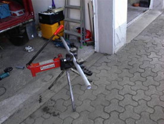 Die Anpassung des vorderen Bügels erwies sich als etwas schwieriger, da dieser sowohl nach innen als auch etwas nach hinten geneigt sein sollte. Daher habe ich einen kurzen Besuch beim Klempner meines Vertrauens getätigt und ein hydraulisches Rohrbiegegerät geliehen.